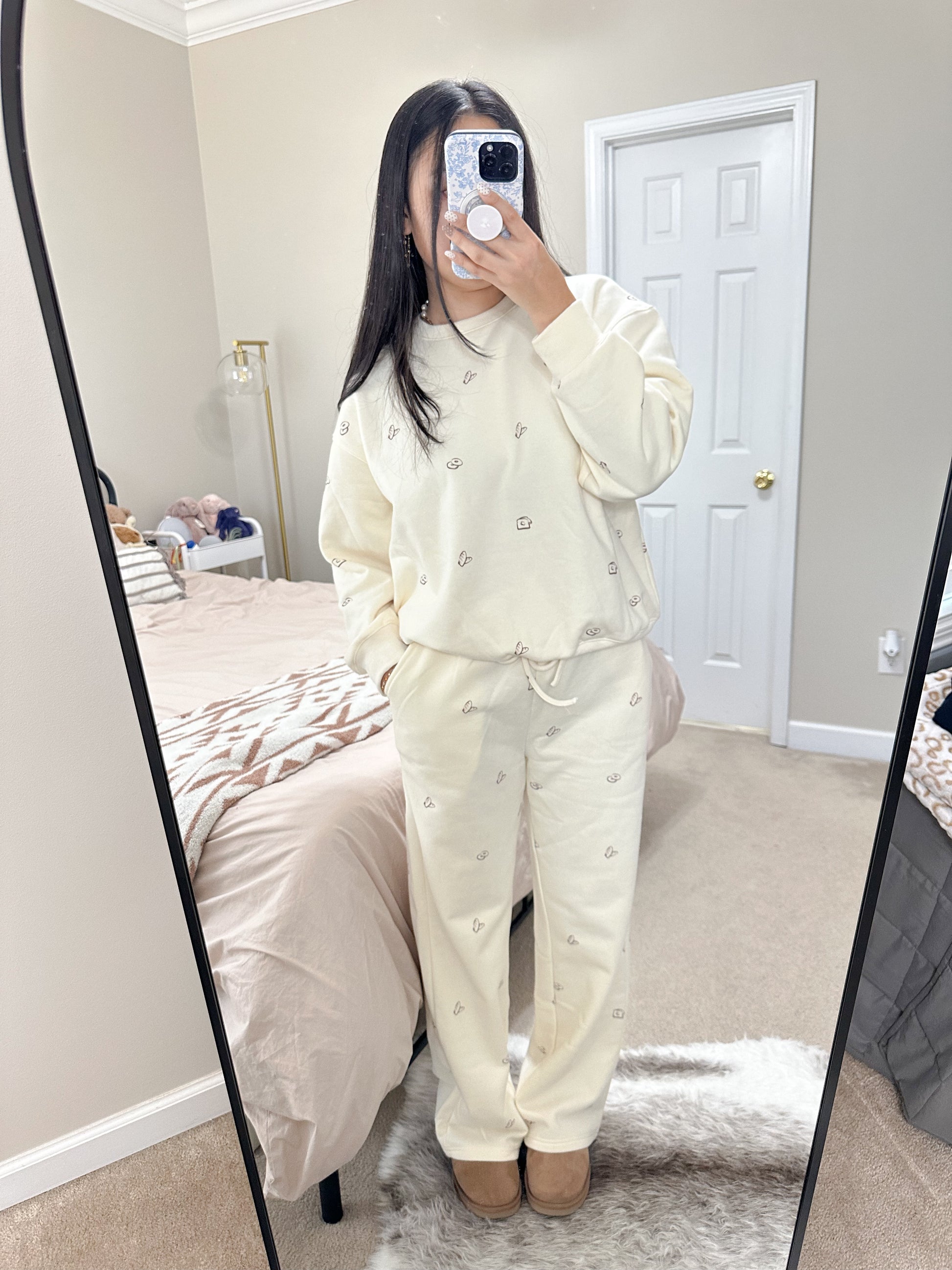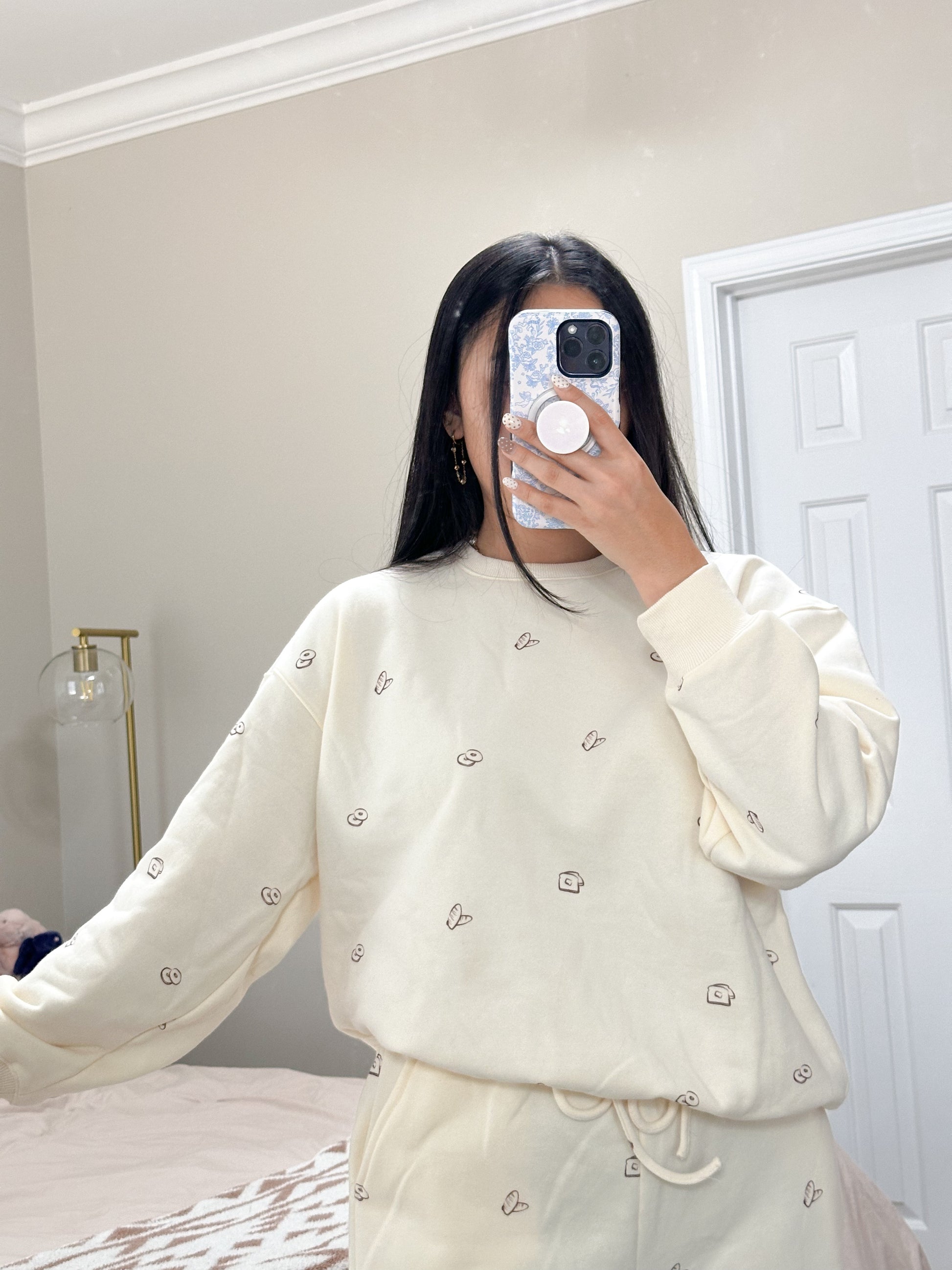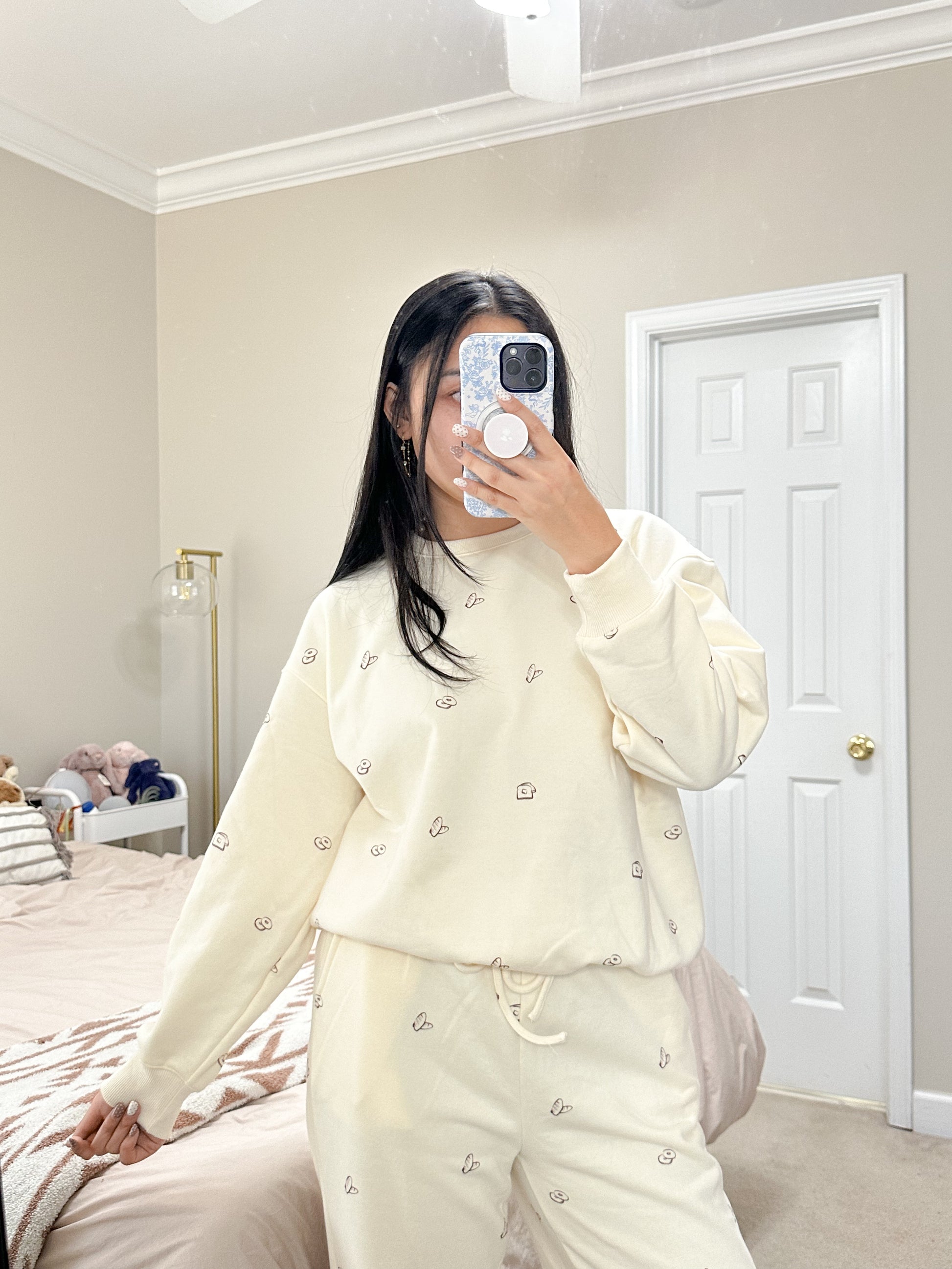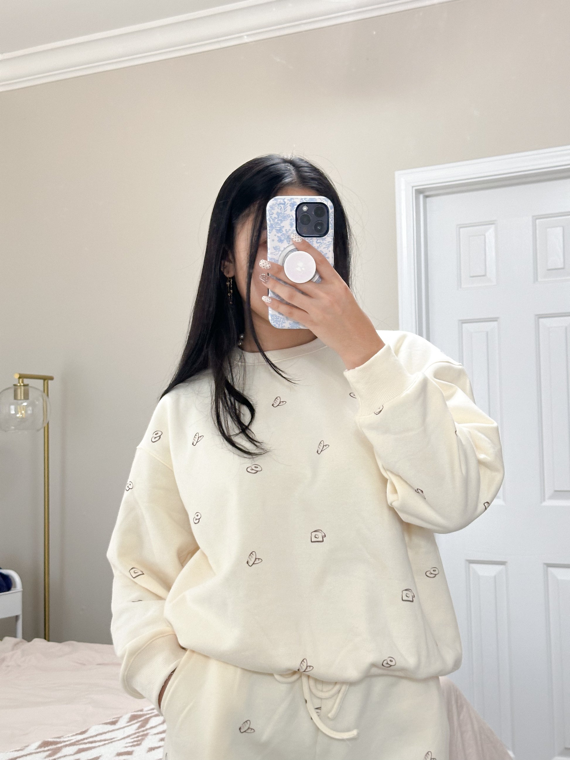 Cozy and sweet— the Buttercream Bakery Lounge Set is your new everyday treat. Made from ultra-soft fleece with an allover bakery-style print, this matching sweatshirt and wide-leg jogger combo delivers that perfect “cute without trying” vibe. Think warm bakery mornings, soft pastries, and comfort you can wear.